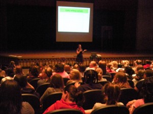 I’m sorry for anyone who did not win, but I am glad that Scribner did, because not only is their auditorium gorgeous, their teachers organized, and their kids an ideal audience, but they made 250 kids available to come hear me speak! Thank goodness I was a teacher before I was an author, because this was a big crowd, y’all. The pictures tell the story best, so I’ll let them do it…